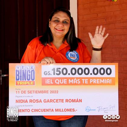 ¡Nidia Rosa Garcete Román de Tebicuary sabe lo que es ser afortunada! En el sorteo del 11/09/22, con el cartón del Telebingo Triple, completó la 3ra. cantada. Ahora, 150 millones están en su bolsillo. ¡Animate a cambiar tu suerte y comprá tu cartón ahora! Telebingo Triple: El que más te premia.